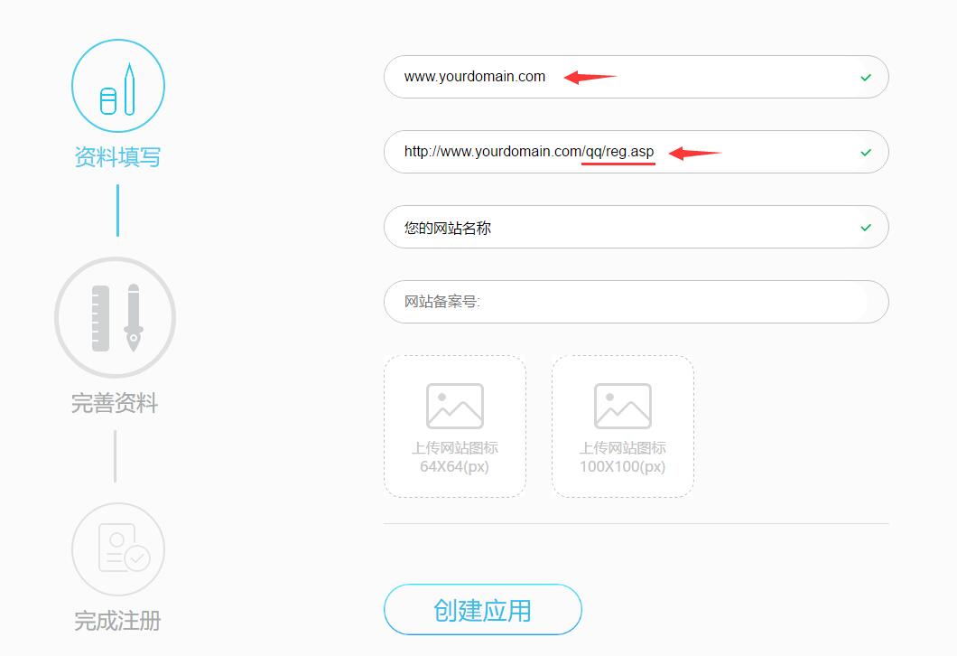 需要注意的地方:(1)回调地址为http://你的域名/qq/reg.asp或http://你的域名/qq/reg.php不可填错